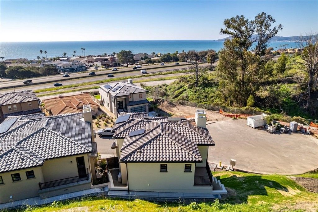 Front-row sunsets and effortless coastal luxury define this newly built, west-facing Mediterranean-inspired home with panoramic ocean vistas and a stunning foothill backdrop in Pismo Beach. Designed for comfort, accessibility, and modern living, this exceptional residence features owned solar, an in-home elevator serving the first through third floors and abundant storage throughout. A paver driveway and professionally landscaped grounds create a striking first impression, leading to the two-car garage and a thoughtfully designed entry level offering a tankless water heater closet, under-stair storage, and elevator access. The open-concept main living level is designed to impress, showcasing rich Bravada hardwood flooring, elegant paneled doors, and exceptional craftsmanship throughout. The ocean-view dining area flows effortlessly into the living room, anchored by a gas fireplace and opening to an expansive deck with sweeping ocean views"”perfect for entertaining or unwinding at sunset. The chef's kitchen is outfitted with all-new KitchenAid stainless steel appliances, including a range, range hood, dishwasher, refrigerator with ice maker, beverage center, and combo microwave wall oven. Quartz countertops, classic shaker cabinetry, a large island with seating, and a pantry closet complete the space, delivering both elevated style and everyday functionality. Also on this level is a versatile bedroom and a separate full bath are conveniently located just off the kitchen, ideal for guests, multigenerational living, or a private home office. A serene terrace complete with privacy fencing completes the level. Upstairs, the primary suite is a true coastal retreat, featuring sweeping ocean views from a private deck, a spacious walk-in closet, and a spa-inspired ensuite with dual-sink vanity and walk-in shower. A secondary suite offers its own private hillside-view balcony and ensuite bath. A thoughtfully designed laundry center with sink and abundant storage adds ease to daily living. Just moments from the beach, local shopping, dining, and entertainment"”and only minutes to San Luis Obispo and the regional airport"”this home delivers sunset-soaked coastal living with modern comforts and timeless style.