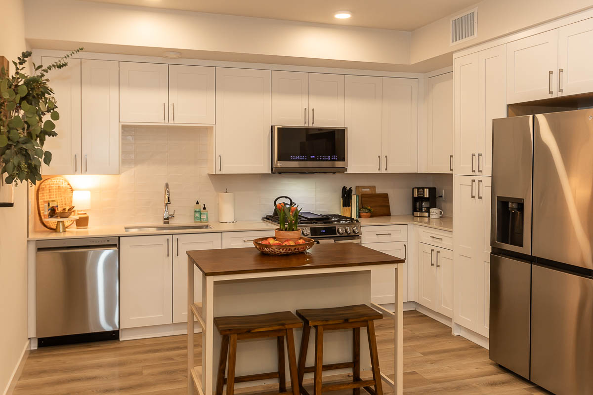Designer Kitchen – Features quartz countertops, high-end stainless steel appliances, soft-close cabinetry, a stainless undermount sink, and a large island with bar seating.