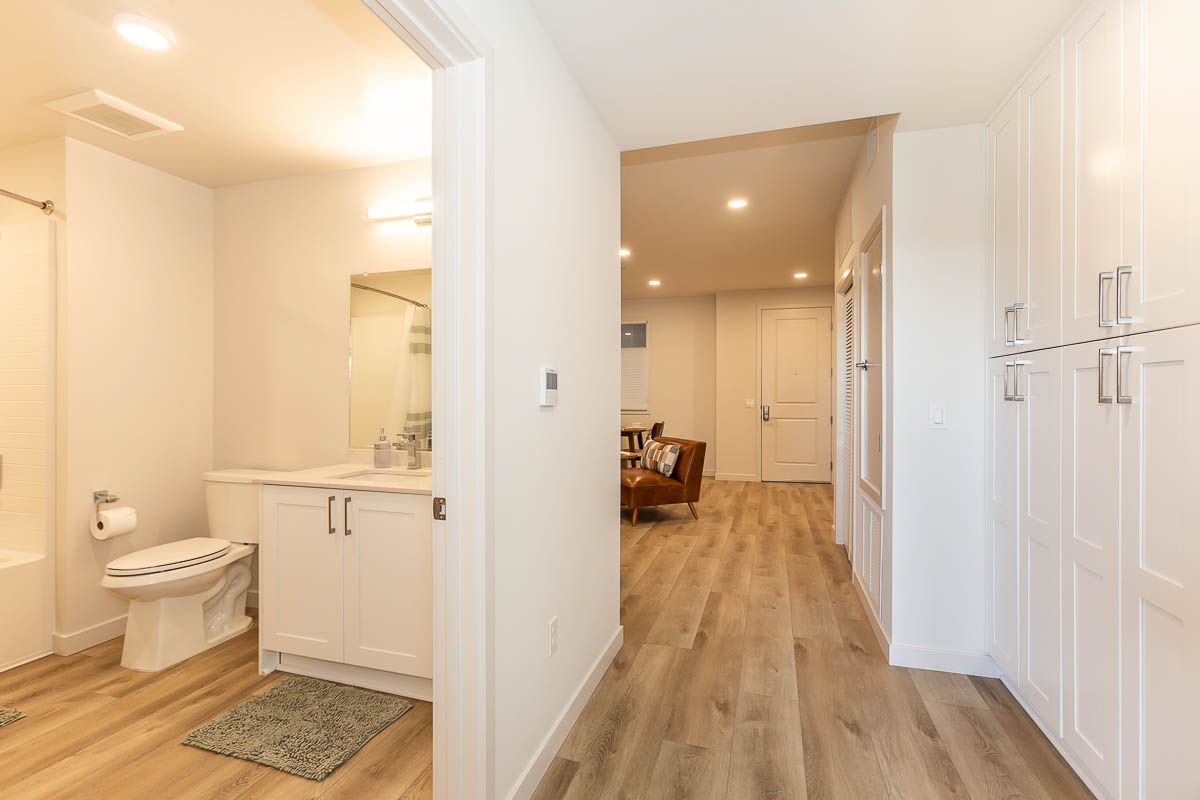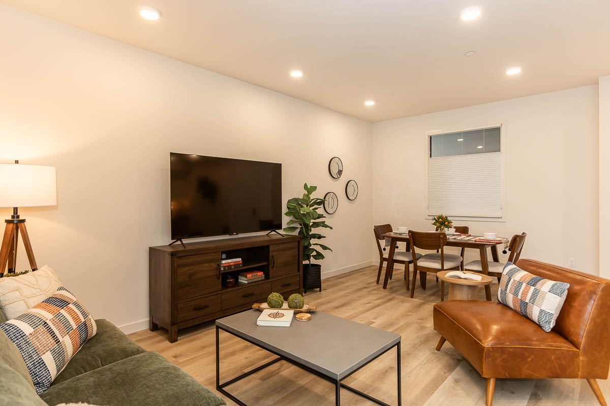 Modern Open-Concept Loft Design – Over 1,200 sq. ft. of contemporary living space with 9-foot ceilings, recessed lighting, built-in cabinetry, and wood-plank flooring throughout.