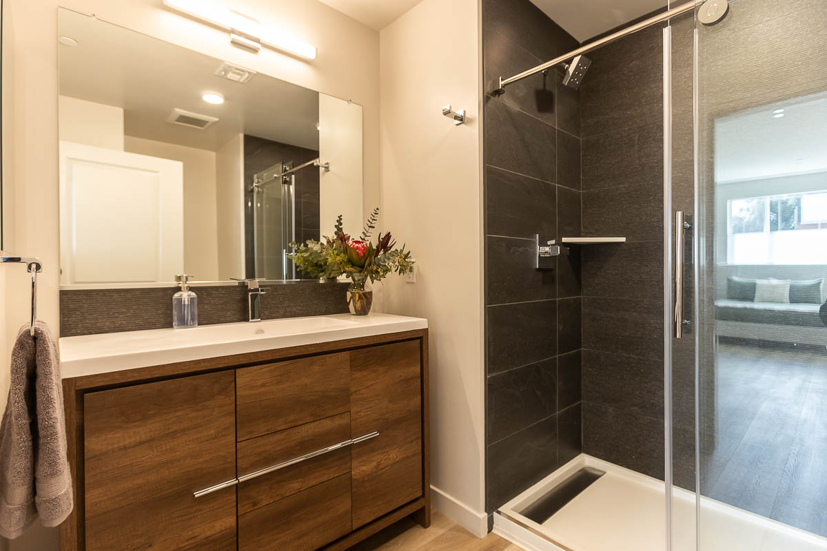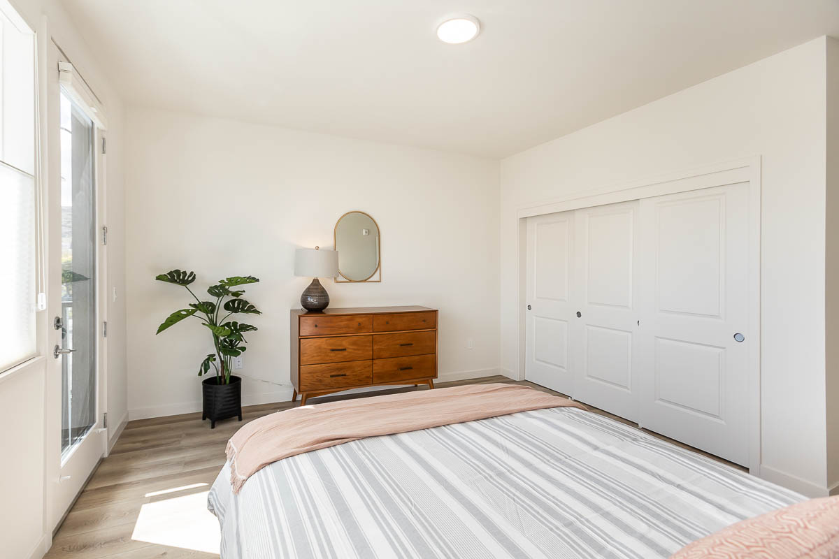 Both bedrooms are generously sized. The primary suite features dual closets and a private en-suite bathroom with a designer tile shower, while the large guest bedroom opens to a deck showcasing beautiful views of the city and surrounding mountains.