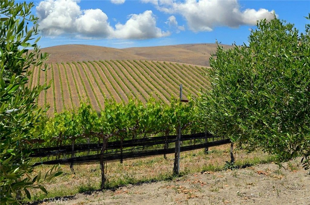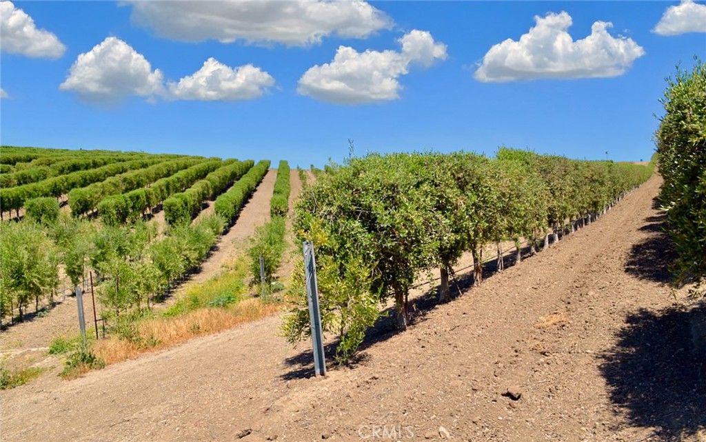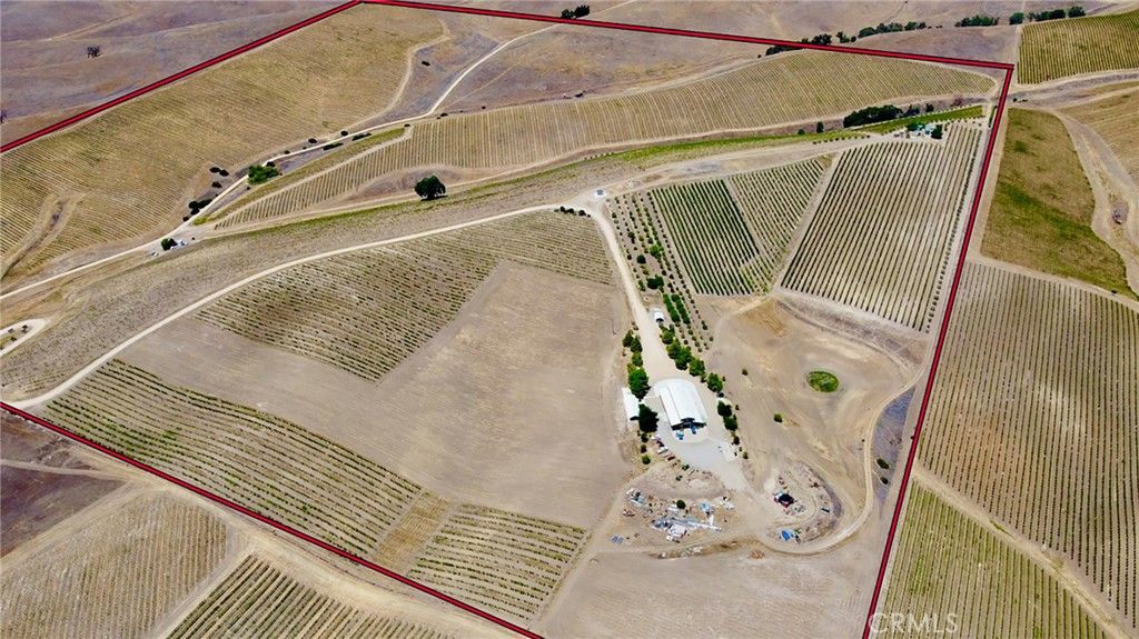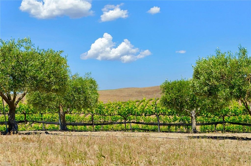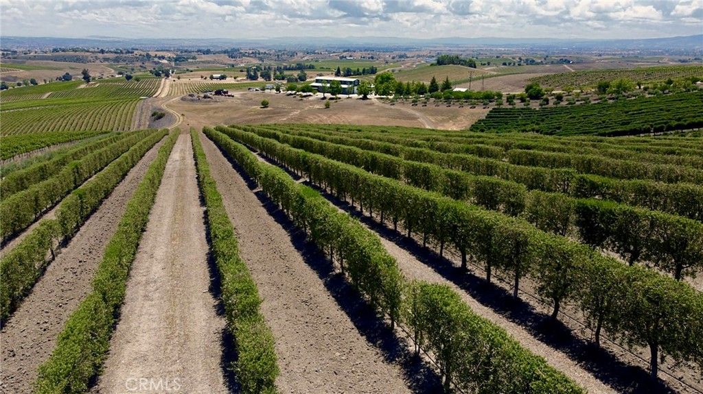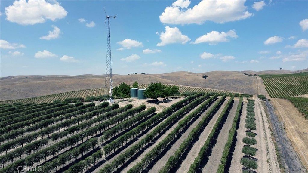 This breathtaking and prestigious 162.61 acre Olive Ranch and Vineyard is located in the rolling hills of the Paso Robles Estrella Appellation. Specializing in the growing and production of award-winning Extra Virgin Olive Oil and premium wine grapes. The property features a beautiful 4950 sq.ft. two story barn. The lower floor of the barn is equipped with a permitted bathroom, shower, water softener, laundry, and septic system. Heavy concrete paving surrounds the entire barn. Just off from the barn is a stunning open concept entertainment center with fountain, water misters for warm days and a beautiful fireplace for cool evenings. The shooting range located on the other side of the barn has a 10X10' concrete shooting stand, aiming out to movable short and long range targets. The property agricultural mainstay of the property is its 87 acres of vineyards (Cabernet Sauvignon, Sauvignon Blanc, Petite Sirah, Malbec, Petite Verdot, Sangiovese) and 15+ acres of Olive trees (Arbequina, Koronieki and Mixed Tuscan). There is a 1 acre lavender field and another 18.8 acres of additional olive tree or vineyard expansion. Five 10,000-gallon water storage tanks co-located in a hill-top tank farm with electronic controls and water level indicators. The Irrigation system is gravity fed from tanks throughout the olive blocks and eastern part of the vineyard. The water is supplied by 2 permitted and vested wells. The wells are 650' deep and produce 70-100GPM with no water table issues. Water quality is excellent and water pressure is 35-50psi throughout. Forever views Gazebo: 16ft. diameter, octagon, Amish style shade gazebo on heavy elevated concrete slab with electric fan and lights and views. The Bergey 10 Kw Wind Turbine Generator mounted on a 100 ft. tall heavy duty, galvanized steel tower structure also supports a wi-fi repeater station that is leased, providing free high power internet and wi-fi service to the property. This stunning property has numerous possibilities for the building of a primary Residence. Truly a special place that makes beauty, prestige and profitability a reality.