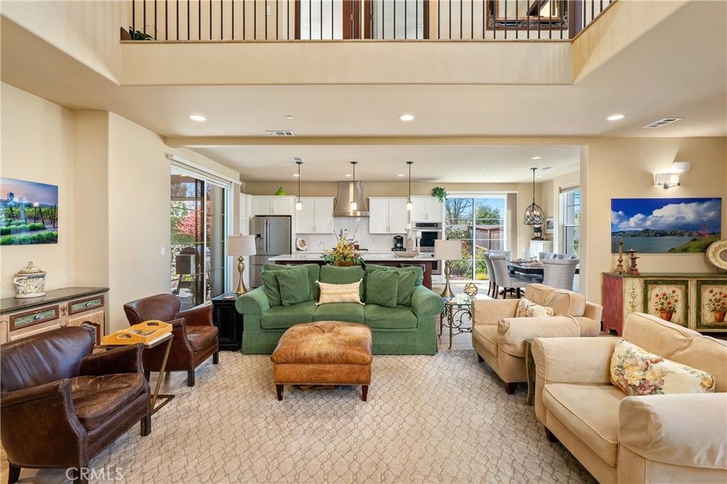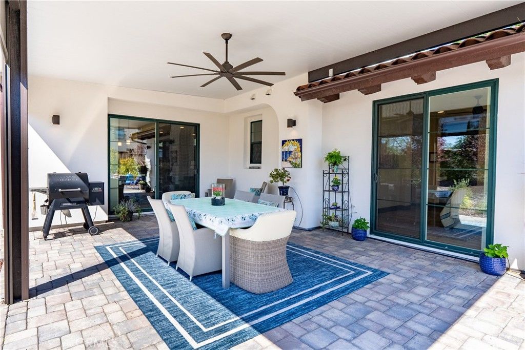 Welcome to 9300 Via Castillo in the Atascadero neighborhood of Cerro Roble! Built in 2021, this Santa Barbara Spanish-style home is a beautifully designed 4-bedroom, 2.5-bath residence offering approximately 2,546± sq ft showcasing modern elegance, thoughtful architecture, and comfortable living on an 11,579± sq ft lot. A brick-paved driveway and walkway lead to the home's inviting entry, complemented by a landscaped front yard that enhances the property's refined curb appeal. Inside, the open-concept main level is designed for both everyday living and entertaining. The spacious living room is highlighted by a cathedral ceiling open to the second story, allowing natural light to pour into the space while creating a sense of volume and sophistication. A gas fireplace and striking metal chandelier provide an elegant warm focal point. The kitchen blends style and function with a large center island, quartz countertops, stainless steel appliance package, and double oven, while sliding glass doors from both the kitchen and dining area create a seamless connection to the backyard. The primary suite on the main level offers flexibility and comfort, featuring a walk-in closet, sliding glass door access to the backyard, and a well-appointed bathroom with dual sinks, step-in shower, and a separate toilet room. The first floor also includes a laundry room with upper and lower cabinetry and a convenient half bath. Upstairs, three additional bedrooms provide comfortable accommodations, including one generously sized bedroom offering versatile use as a secondary living space, office, or guest retreat. The upstairs hall bathroom includes dual sinks and a separate shower and toilet room. The backyard is designed to enhance outdoor living with two distinct patio areas finished with stone pavers. The covered patio features electric shades and a ceiling fan, creating a comfortable setting for gatherings or quiet evenings outdoors. A second patio area is enhanced by two decorative blue fountains, adding character and ambiance. The side yard offers a versatile flex area that may be suitable for storage, workspace, or gardening. Additional features include a 2-car garage and a well-planned layout that balances modern style with everyday comfort.