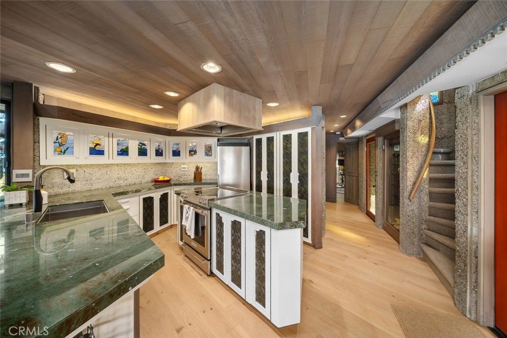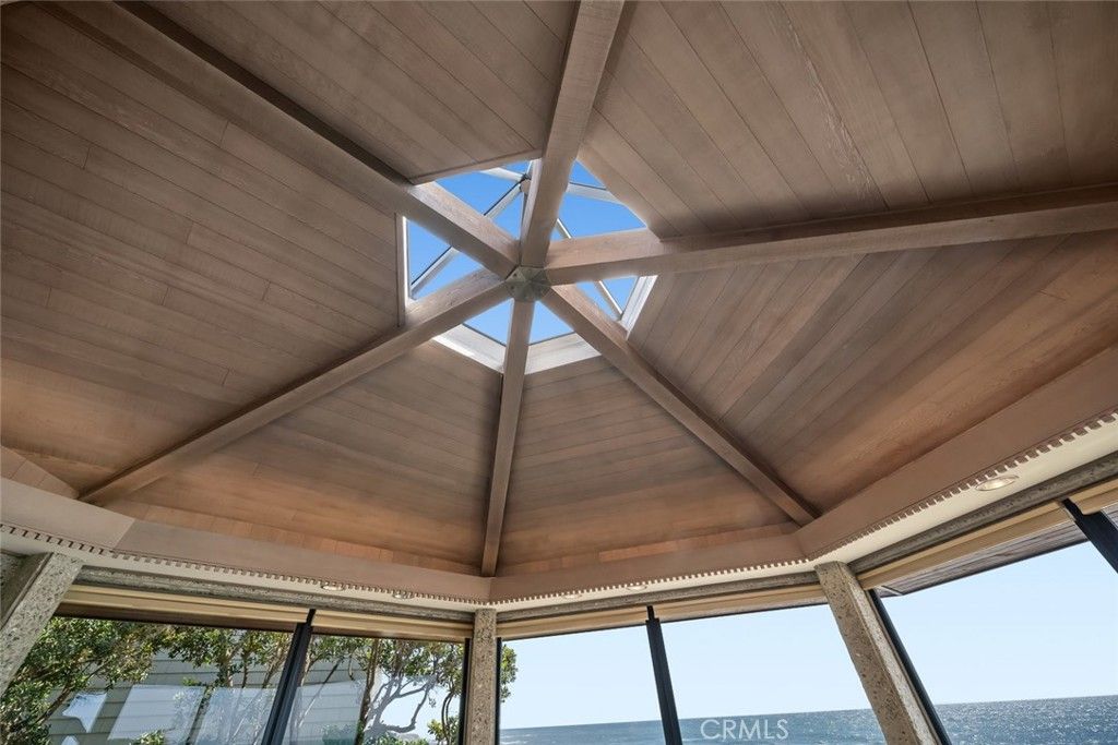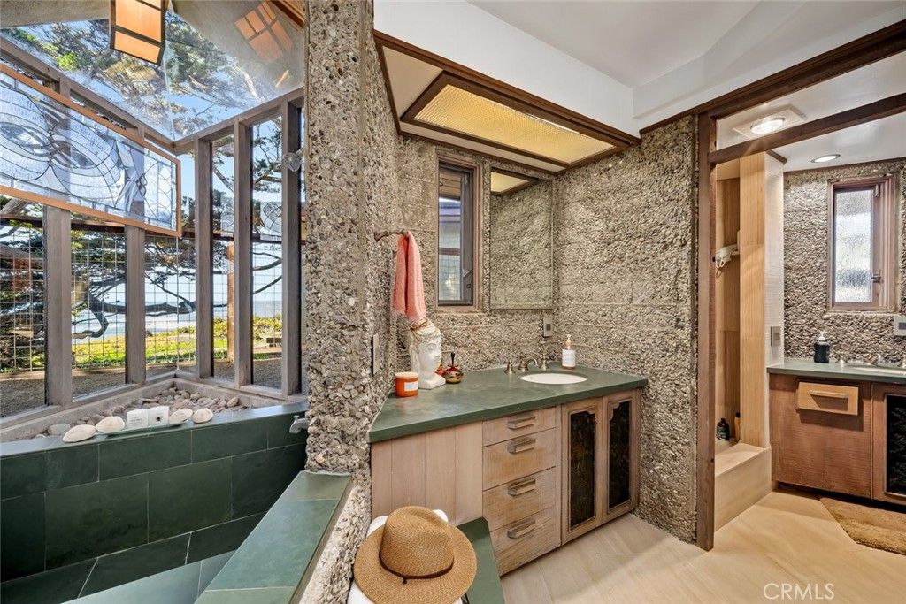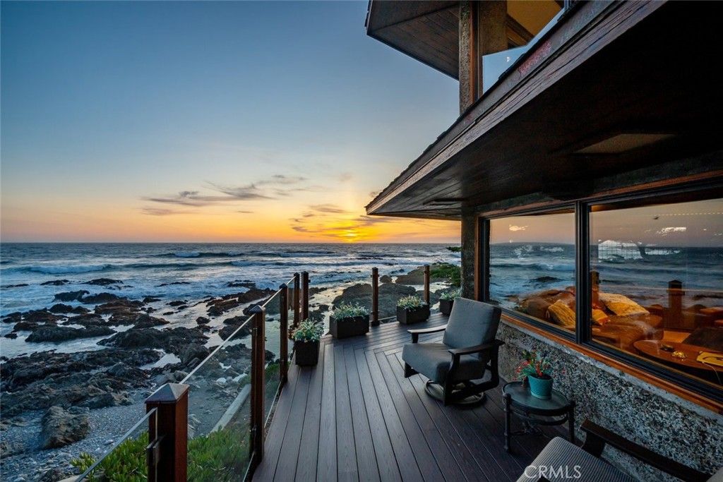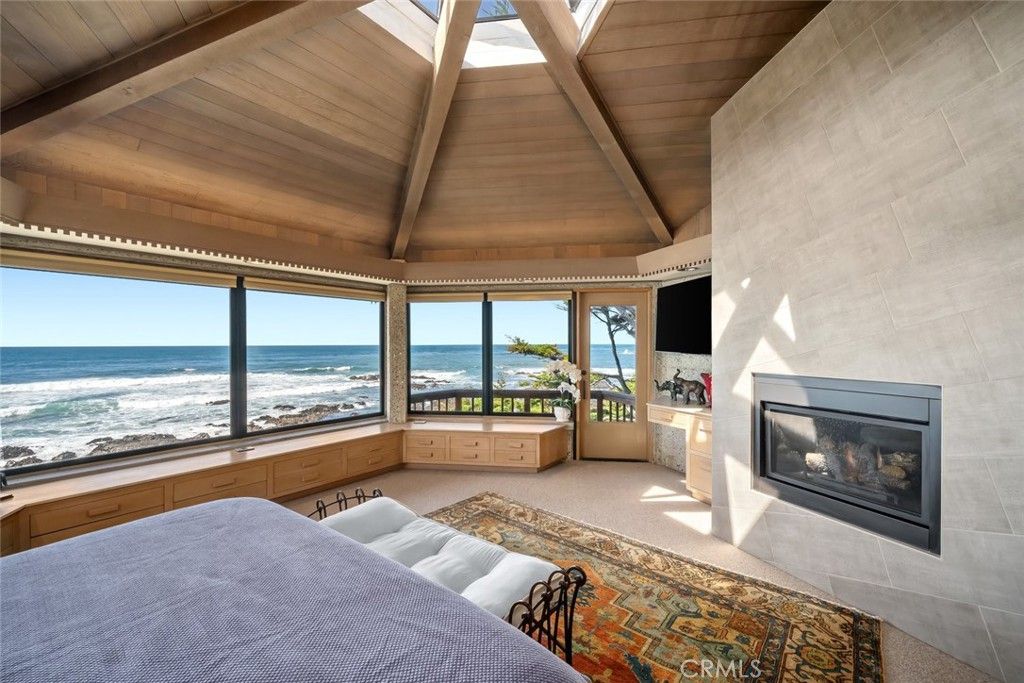 The pinnacle of art, architecture, and coastal living, 2431 Sherwood Drive is a rare oceanfront architectural masterpiece designed by legendary local architect Warren Leopold, a protégé of Frank Lloyd Wright. Built at the height of mid-century modernism, this iconic Big Sur Modern residence is constructed of poured-in-place aggregate concrete and redwood, expressed in a sophisticated series of hexagonal spaces that celebrate light, geometry, and the natural environment. Set forward on a seawall-protected bluff, the home offers over 180 degrees of unobstructed panoramic ocean views, with daily sightings of whales, dolphins, otters, seabirds, tide pools below, and spectacular sunsets. Thick exposed aggregate walls frame expansive new dual-pane windows and signature stained glass"”some inlaid with sliced agate"”bringing exceptional light, color, and texture throughout. The open-concept kitchen, dining, and living areas are designed for both comfortable living and effortless entertaining. The chef's kitchen features top-of-the-line appliances, custom cabinetry, and a generous granite island oriented toward the sea. Redwood beams, whitewashed redwood paneling, slate and stone surfaces, built-in seating, fireplaces, skylights, dentil detailing, and an indoor-outdoor bar enhance both function and character. A protected ocean-view courtyard and wraparound decks with new glass railings extend the living space outdoors, while private concrete stairs provide rare direct access to the shoreline and tide pools. The home includes three en-suite bedrooms. The primary suite is accessed by a dramatic primary suite accessed via a stained-glass-lined turret staircase, featuring wraparound windows, domed skylight, fireplace, spa-style bath with ocean-view soaking tub, connected office, and walk-in closet. Downstairs a second en-suite bedroom has own fireplace. A secondary living area with its own living room, laundry, and the third en-suite bedroom with separate entrance adds flexibility and income potential. The property is a successful, permitted vacation rental. Located among Monterey cypress, close to Fiscalini Ranch Preserve, Moonstone Beach, Lampton Cliffs County Park, and the West Village of Cambria, this one-of-a-kind home offers architectural significance, privacy, and an unparalleled connection to the Pacific Ocean.
