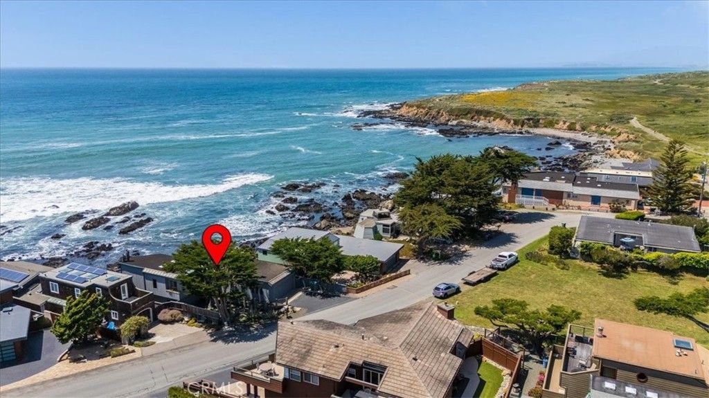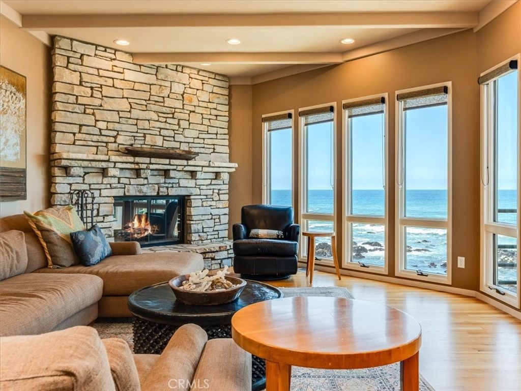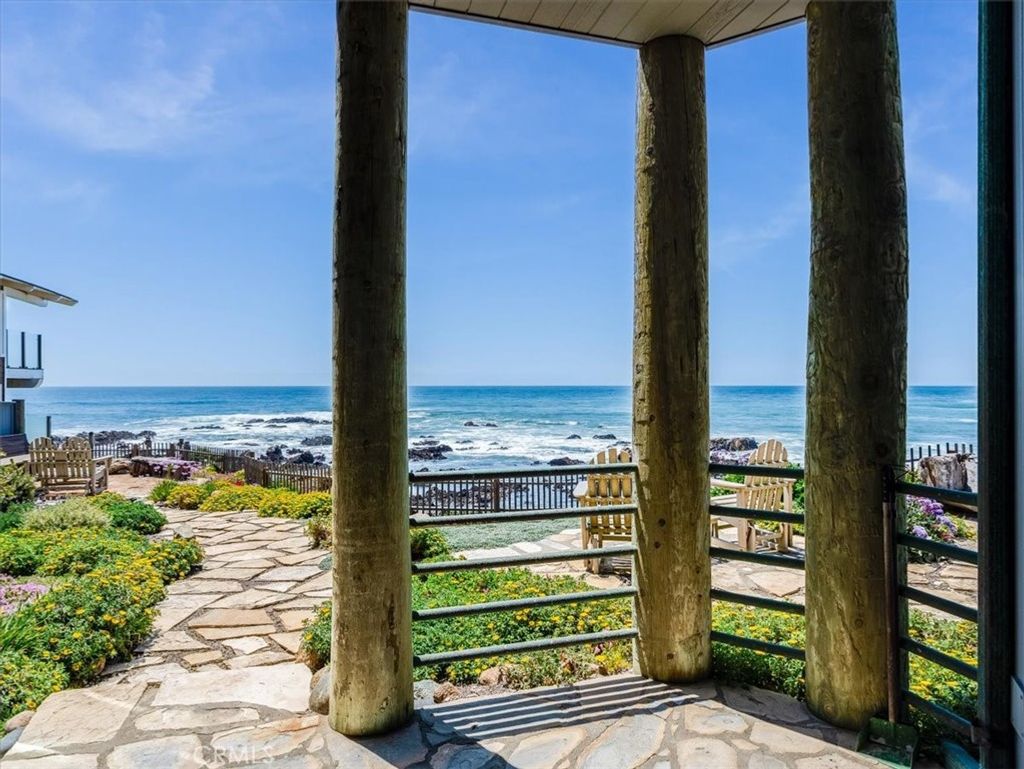 Welcome to your ultimate coastal escape"”where unmatched, unobstructed panoramic ocean views take center stage in this stunning multi-level 3-bedroom, 3.5-bath home with 2,130 sq ft of living space on a 6,417 sq ft oceanfront lot. Floor-to-ceiling windows span the entire back of the home, flooding nearly every room with natural light and breathtaking views of the Pacific. The entry-level features a welcoming foyer, a spacious bedroom with full bath, and access to the attached garage. Upstairs, the main living level showcases a seamless blend of indoor-outdoor living with expansive ocean vistas from the living room, dining area, and chef's kitchen"”complete with top-tier appliances, custom fossil-inlaid backsplash, and breakfast bar seating. A cozy fireplace with stone hearth, wet bar, and sliding glass doors to the ocean-facing deck create the perfect setting for relaxing or entertaining. A powder and sitting room complete this level. Downstairs, the lower level features a second bedroom with ensuite bath, laundry room, and the primary suite, where sweeping ocean views, a fireplace, window seat, and a luxurious spa-style bath with jetted tub, separate shower, and private sauna await. Outside, the back patio is thoughtfully designed with slate pavers winding through multiple view-focused seating areas, while a stone stairway leads directly to the beach and tide pools below"”offering a rare and immersive coastal experience. This exceptional home presents a rare opportunity to own front-row, forever ocean views"”ideal as a full-time residence or luxurious second home. Just minutes from Cambria's charming village, with boutique shops, wine tasting, fine dining, and year-round events. An extraordinary opportunity to own one of Cambria's most breathtaking oceanfront properties"”where every day begins and ends with endless horizon views.