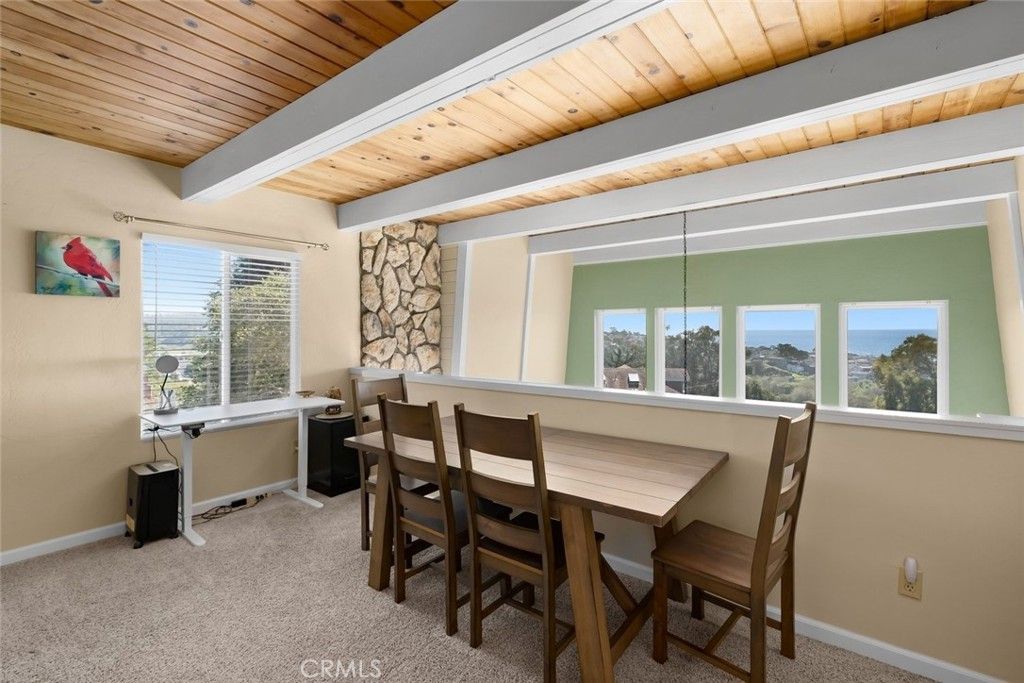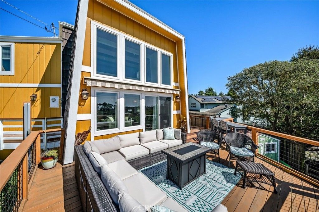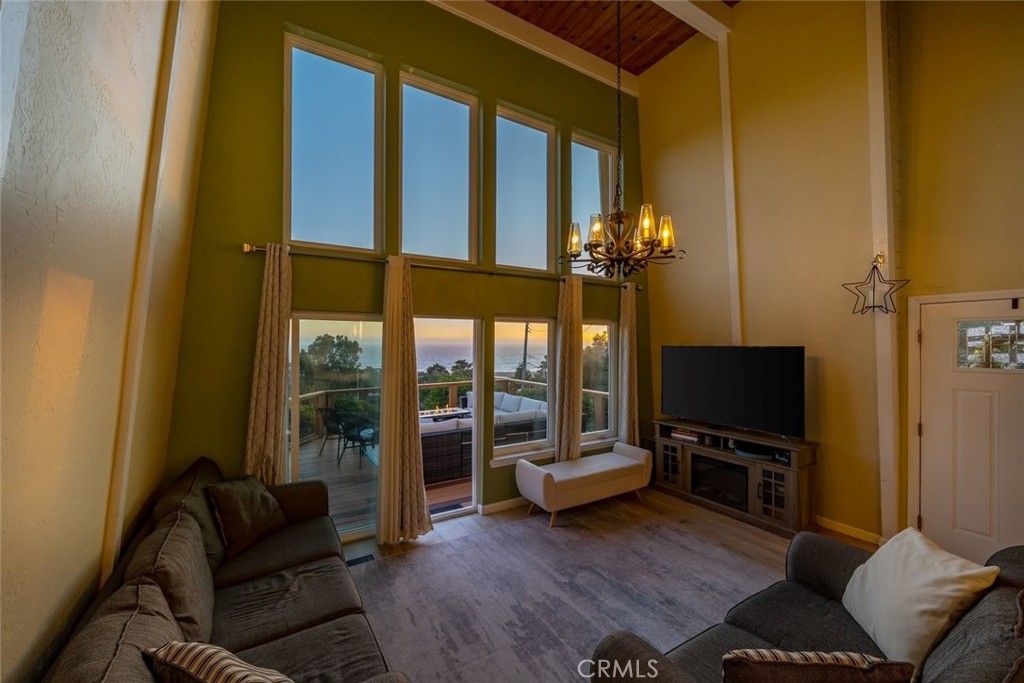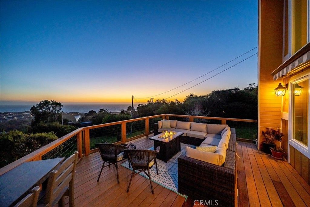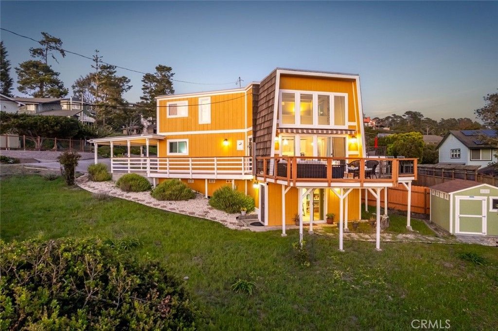 Enjoy some of the most captivating panoramic ocean views in Cambria from this beautifully remodeled 3-bedroom, 2-bath home set on a street-to-street 13,433 sq ft lot on sought-after Happy Hill. Just moments from the West Village and Moonstone Beach, the home offers an effortless beach-home feeling paired with thoughtful modern upgrades. The newly remodeled kitchen features crisp quartz countertops and updated finishes, perfectly complementing the refreshed bathrooms. A bedroom and full bath on the main living level add convenience and flexibility. The dramatic living room"”with nearly 18-foot ceilings, a cozy fireplace, and expansive windows"”opens to a large view deck that truly extends the living space. It's an ideal setting for morning coffee, outdoor dining, or simply taking in the whitewater views of Moonstone Beach and the Santa Rosa Creek estuary. A versatile bonus room below provides additional space for guests, hobbies, or work, and a detached storage shed offers extra room for tools, gear, or creative uses. The street-to-street configuration enhances privacy and helps protect the incredible views that make this home so special. A rare blend of coastal charm, modern comfort, and sweeping ocean vistas"”this home captures the very essence of Cambria.