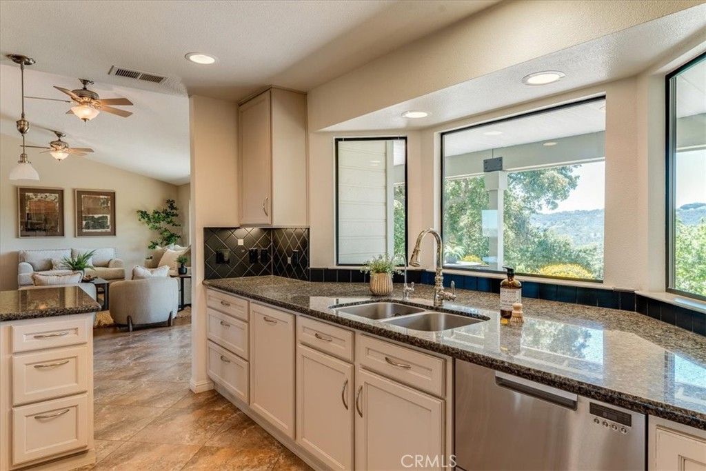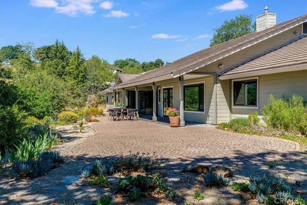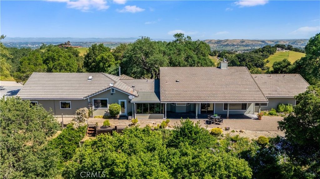 Welcome to this serene single-level home with guest quarters set atop 4 oak-studded acres, offering breathtaking views and a lifestyle feeling like a true retreat. This home offers the flexibility of either a 3 bed/2.5 bath home with attached 1 bed/1 bath guest quarters or a 4 Bed/3.5 Bath home. Additional bonuses are owned solar, 3-car garage with workshop area, and above-garage attic bonus space. The home offers an updated and spacious kitchen with butler's pantry for extra prep space and storage. Off each side of the kitchen you'll find the dining room and peaceful sun room to soak in the views. The family room opens to the kitchen offering a cozy gas fireplace, while the living room is adorned with a wall of shelving and cabinetry. The laundry room and half bathroom add convenience to this wing of the home. The private bedroom wing of the home boasts the spacious primary suite, two additional bedrooms and a hallway bathroom with shower. In the primary suite, unwind with tranquil vistas, private patio, extensive built-in storage, walk-in closet, and ensuite bathroom with separate vanities, tub and walk-in shower. The attached guest quarters wing of the home is a versatile area offering 1 bedroom, 1 bathroom with shower, spacious living/dining area with convenient built-in shelving and cabinetry for a desk area or future kitchenette, wood burning stove and separate AC system. Outside, the patio invites you to revel in the sweeping views, with easy access to raised garden beds and trails that wind through the property's tranquil lower acreage. The home is equipped with owned solar panels, whole-house water softener, reverse osmosis system in the kitchen, and hot water recirculation pump. Additional amenities include engineered hardwood flooring, concrete tile roof with 2019 re-roof of 2 paper layers, 2 AC systems for house and guest quarters, whole house fan, and new drip irrigation system to the front of the property in 2025. The property is serviced by city water, private septic system, natural gas, and PG&E/3CE (Central Coast Community Energy) with the owned solar lowering your bills. Enjoy the coastal breeze that cools down evenings in these west Atascadero hills. This home feels like a countryside escape but is just minutes from local conveniences, Hwy 101, and just a 25 minute drive to San Luis Obispo. This property is more than a home, it's where tranquil living and modern amenities blend together.