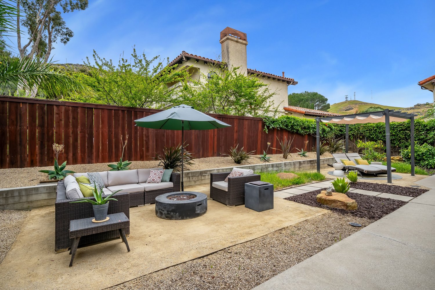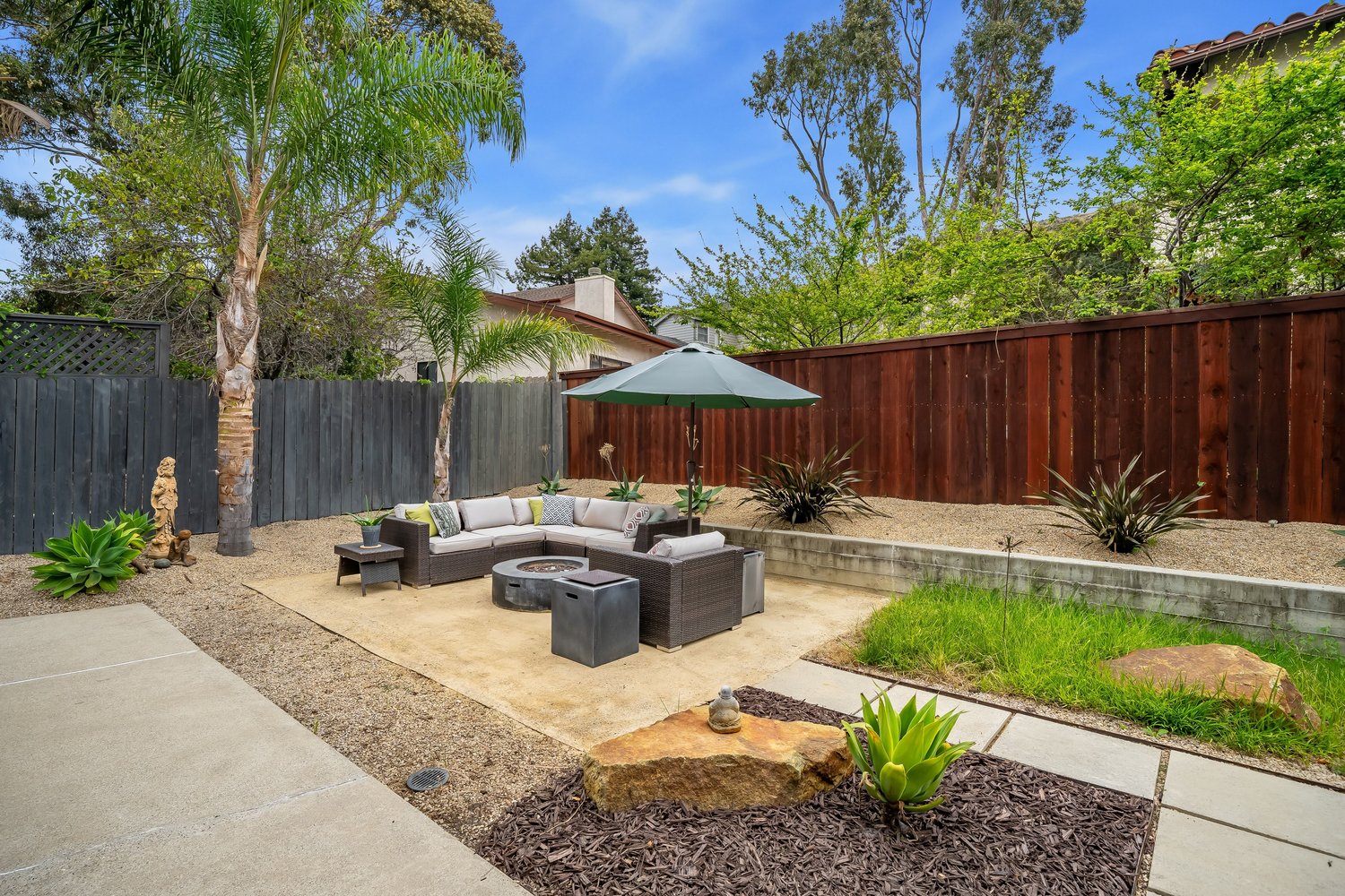 - Landscaped backyard with fire pit and room for gardening