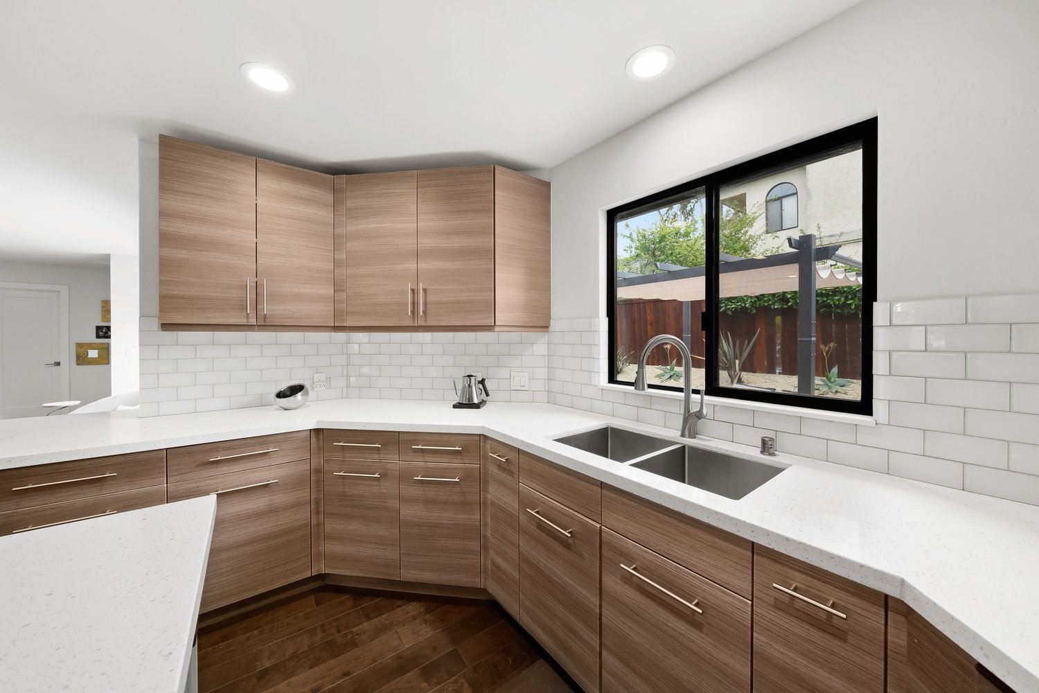 - Modern kitchen with quartz countertops, soft-close cabinetry, and tile backsplash
