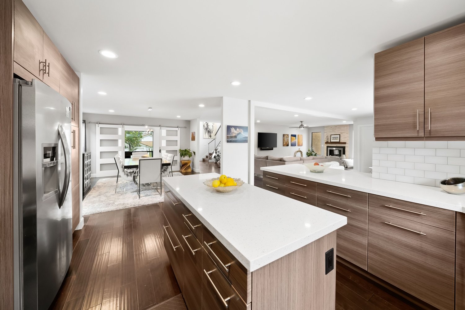 Step inside to soaring ceilings, designer lighting, and a striking modern railing that frames the upstairs loft. The main living level showcases beautiful wood flooring throughout and a completely remodeled kitchen outfitted with soft-close cabinetry, quartz countertops, a stylish tile backsplash, and ample space for both cooking and entertaining. The spacious dining and living areas are anchored by a new gas fireplace with a sleek tile surround, creating a warm yet contemporary focal point.