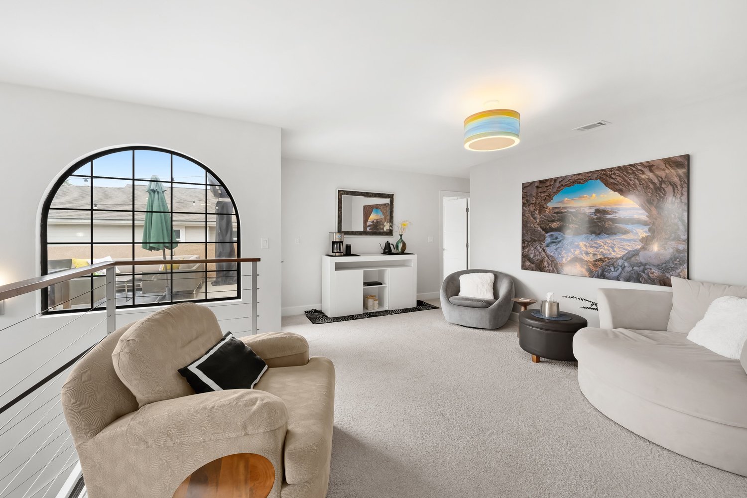 Upstairs, a custom wire-railed staircase leads to a versatile loft and sitting area with direct access to a spectacular view deck overlooking Cerro San Luis Obispo, the park, and the surrounding hills. The luxurious primary suite features a large picture window, walk-in closet, private access to the deck, and a fully remodeled en-suite bathroom with dual vanities, a frameless glass shower, and an expansive walk-in shower with a rain showerhead. Two additional bedrooms share a well-appointed upstairs bathroom.