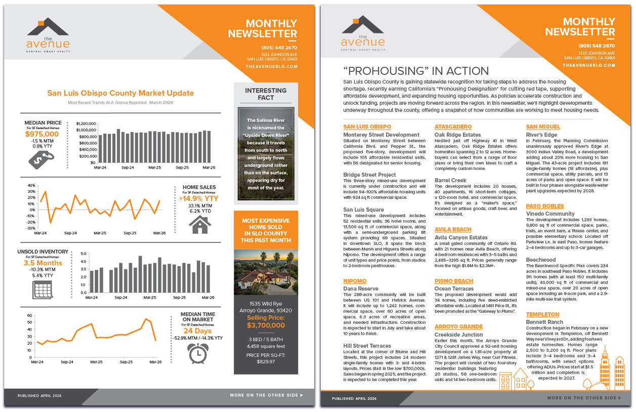 SLO County Market Update & Article on “PROHOUSING” In Action *INTERESTING FACT – The Salinas River is nicknamed the “Upside Down River” because it travels from south to north and largely flows underground rather than on the surface, appearing dry for most of the year. “PROHOUSING” In Action San Luis Obispo County is gaining statewide recognition for taking steps to...