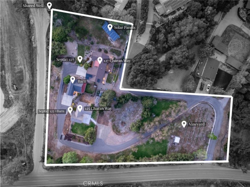 Introducing "Sonterra Estates" "” a rare, refined multi-residence property blending timeless character, modern comfort, and rural sophistication. Set on a peaceful parcel on the outskirts of Arroyo Grande, this thoughtfully designed property offers two independent homes, a barn, and curated outdoor spaces that balance connection, flexibility, and everyday ease. Whether envisioned for multi-generational living, a private retreat, or income potential, "Sonterra Estates" delivers a lifestyle rooted in comfort and possibility. The newer residence at 127 Charan Way (built in 2008) is a light-filled 2-bedroom, 1-bath home spanning approximately 926 sq ft. Vaulted ceilings, skylights, and expansive windows create an airy, open-concept living space anchored by a fireplace. The kitchen features a center island, breakfast bar seating, stone tile backsplash, built-in appliances, and generous cabinetry, plus a built-in desk. The primary suite offers vaulted ceilings, ample storage, and a private en-suite, while a secondary bedroom provides flexibility. A fenced deck off the kitchen overlooks a private yard with a grassy area and stone walkway, plus a separate firepit space. An oversized 800 sq ft garage with an upper-level loft adds versatility"”ideal for an office, studio, or workspace. The original residence at 125 Charan Way (built in 1900) offers 3 bedrooms and 1 bath across approximately 1,168 sq ft, blending historic character with everyday comfort. Natural light fills the living spaces, while the kitchen includes a breakfast bar, built-in storage, and a dedicated dining area. Bedrooms are well-sized, and a separate laundry area adds convenience. A fully fenced yard provides privacy and space to garden, relax, or entertain. The grounds feature a 798 sq ft barn with utilities, two storage sheds, and a small collection of grapevines alongside mature fig and apple trees"”adding subtle countryside charm. Additional highlights include leased solar servicing both homes and the barn, plus two separate septic systems supporting independent functionality. Located minutes from Arroyo Grande Village and Highway 101, Sonterra Estates offers a rare balance of privacy and accessibility"”close to dining, shopping, and Central Coast amenities while maintaining a peaceful, estate-like setting.