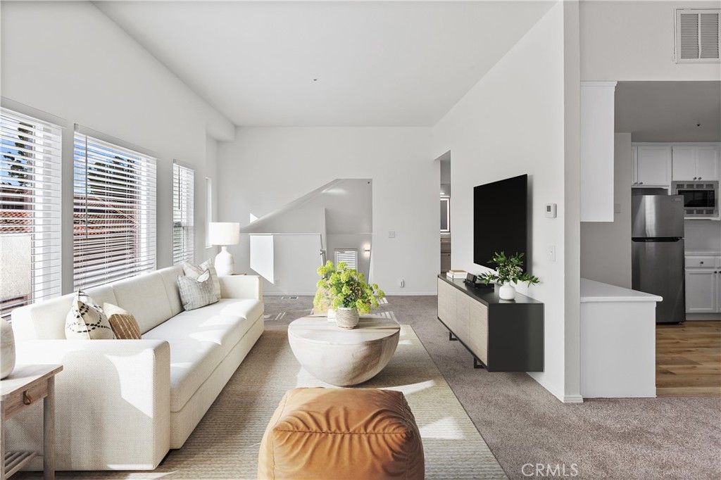 Sun-drenched and beautifully reimagined, this 1,335 sq ft two-bedroom, two-bathroom condo offers a perfect blend of style, comfort, and effortless living. Soaring ceilings and expansive windows flood the home with natural light, creating an airy, welcoming ambiance from the moment you step inside. The lower level features a generously sized bedroom with sliding glass doors that open to a private patio and yard - an ideal guest suite or home office - paired with a full bathroom for added convenience. Upstairs, the open-concept living, dining, and kitchen spaces shine with dramatic ceiling heights, making everyday living feel elevated. Step just outside the dining area to a cozy patio - perfect for morning coffee, evening wine, or gathering with friends under the stars. Down the hall, you'll find a second spacious bedroom, an additional full bathroom, and a conveniently located laundry area, all thoughtfully designed to maximize comfort and functionality. Recent upgrades throughout the home include fresh interior & exterior paint, new carpet and flooring, and brand-new appliances, ensuring a truly move-in-ready experience. Rounding out the property is a large two-car garage with a freshly epoxied floor and a bonus storage room for your bikes, gear, and everything life brings along. Stylish, light-filled, and impeccably updated, this home offers the space you need and the lifestyle you want, ready for you to move in and make it your own. Seller will cover first year of HOA fees.