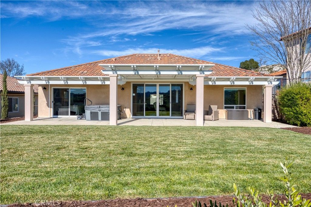 Beautiful single level home with breathtaking views of the surrounding hills, offers nearby conveniences yet seclusion for the homeowner who wants to get away from it all. This three-bedroom, 2 bath home offers approximately 1,757 square feet with an open-concept layout that seamlessly connects to the large, covered patio outdoors, complete with a relaxing hot tub - so you can enjoy the serenity of the nearly one third acre property. The interior features wide-plank oak flooring and a gourmet kitchen with premium JennAir appliances and a generous center island, perfect for entertaining. The master suite offers more captivating views, a cozy fireplace and a spa-inspired bath with soaking tub, separate shower, dual vanities and a custom walk-in closet. Two bedrooms and a full bathroom on the other side of the living area complete the layout. On a pocket street with its own gate code, this home is within the Heritage Ranch Community, yet close to the Oak Hill market, gas station, restaurants and elementary school. Heritage Ranch offers Nacimiento lake access, 2 pools, and an equestrian center. It is a FireWise community, certified by Cal Fire, with fire hydrants nearby on the street and the home has a fire suppression system to help protect the home. Nearly self-sufficient, the home has an owned ground-mounted 7kWh solar field, with a 25-year warranty, a Tesla battery back-up and an EV connector in the garage so the owner can charge up their electric vehicle overnight. Propane is onsite and supplies the water heater, HVAC system, fireplace and kitchen stove. An impeccably maintained pastoral retreat with modern technology advantages. If you want a turn-key vacation home or retirement home, the furniture and wall art can be yours too, just ask how.