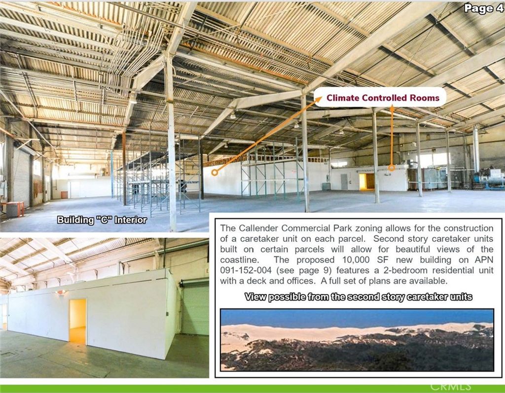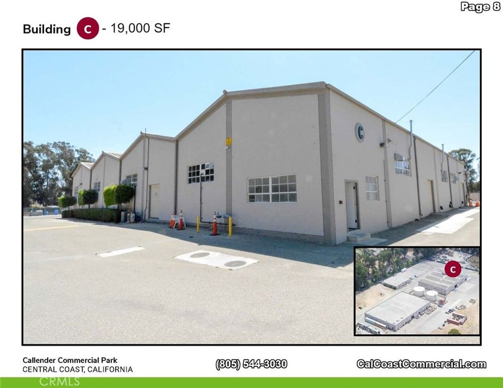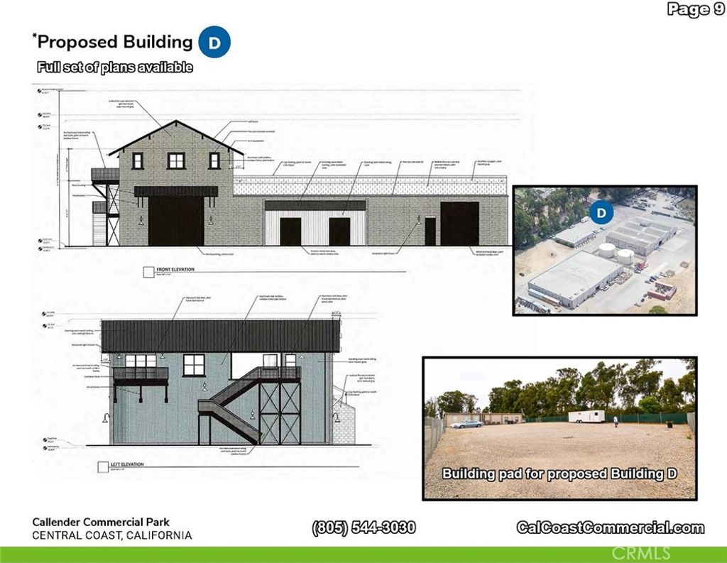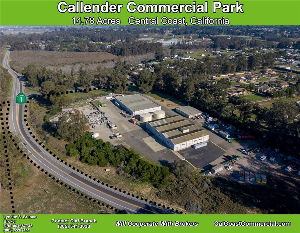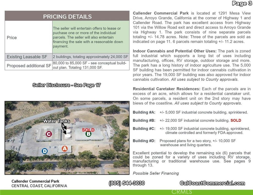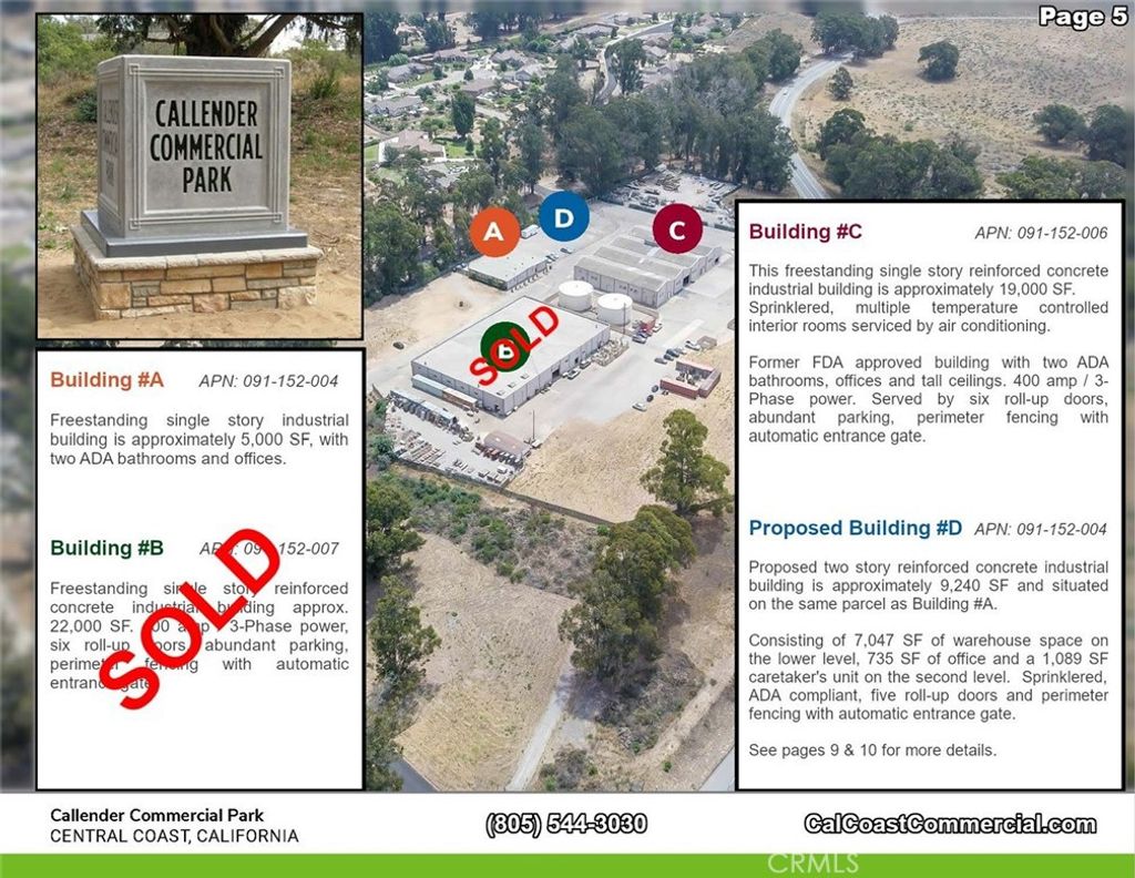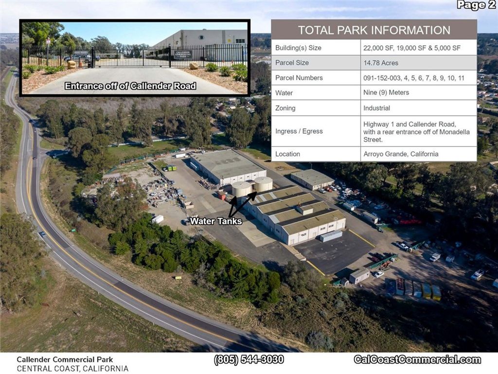 Callendar Commercial Park includes 6 parcels - 2 commercial/ industrial buildings totaling 22,000 sq. feet with commercial/industrial zoning. The 6 parcels together total 11.2 acres. Each of the two buildings are 19,000 and 5,000 square feet, respectively. The property interior has automatic gate and fenced on the Arroyo Grande Mesa directly off Highway 1. The 6 parcels could be zoned for a variety of uses including RV Storage, manufacturing or traditional warehouse use. Most recently the two buildings were used for indoor agricultural growing. The Callendar Commercial Park zoning allows for construction of a caretaker unit on each parcel and could allow for beautiful views of the Pacific Ocean. Building A: A freestanding, single story building with 2 ADA bathrooms and offices. 5,000 square feet Building C: A freestanding, single story, reinforced concrete industrial building is 19,000 square feet. This building is sprinklered and has multiple temperature controlled interior rooms serviced by air conditioning. In addition, it has 2 ADA complient bathrooms, offices vast tall ceilings and 6 roll-up doors throughout with 400 amp/ 3 phase power. Building D: A proposed 2 story reinforced concrete building aproximately 9,240 square feet situated adjacent to, and on the same parcel as Building A.