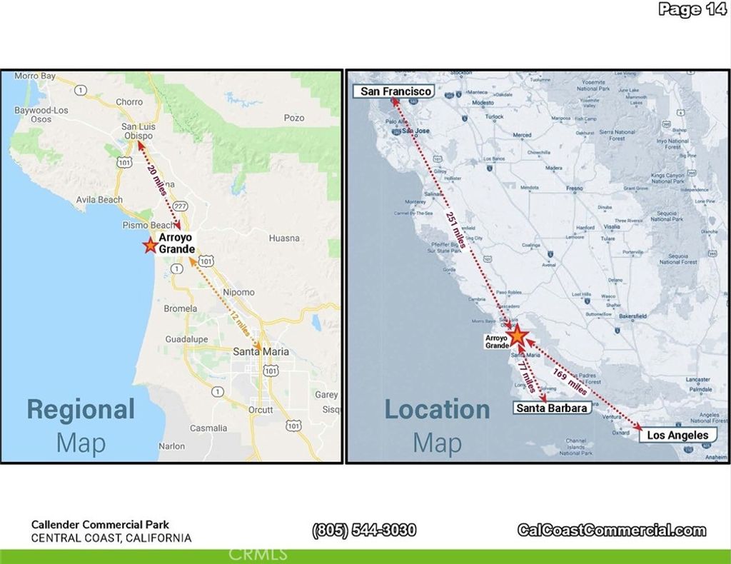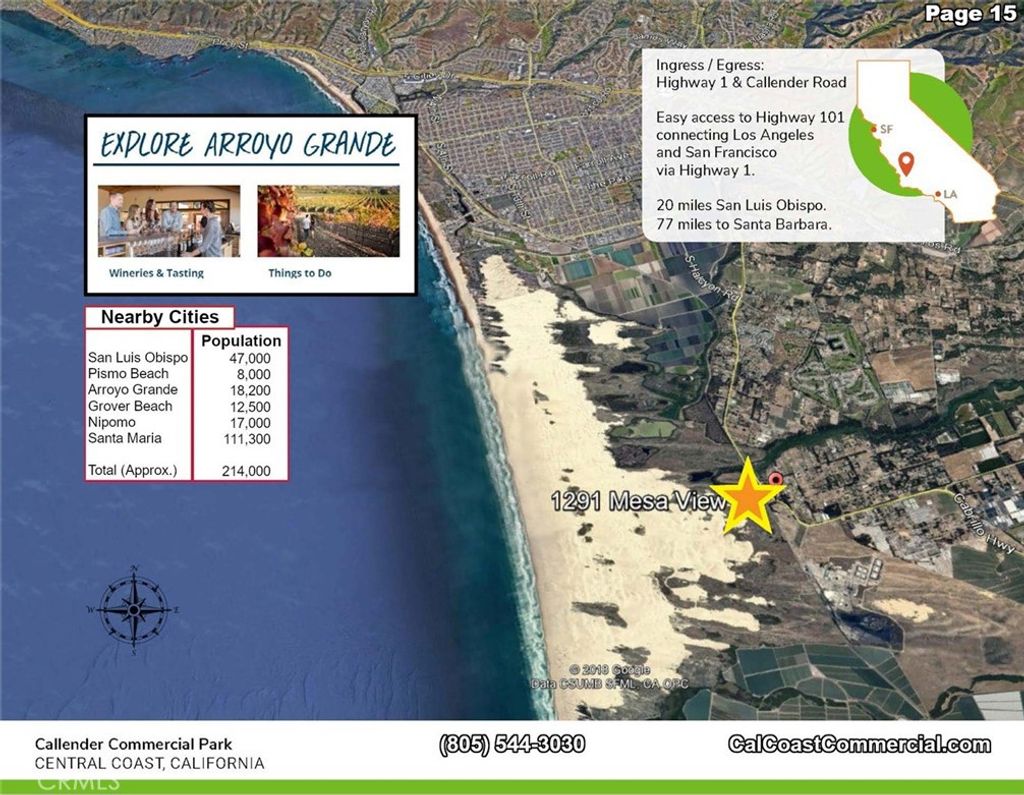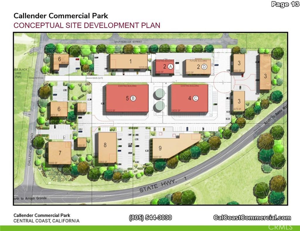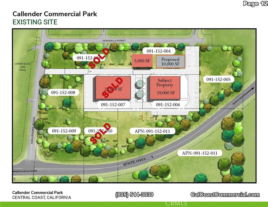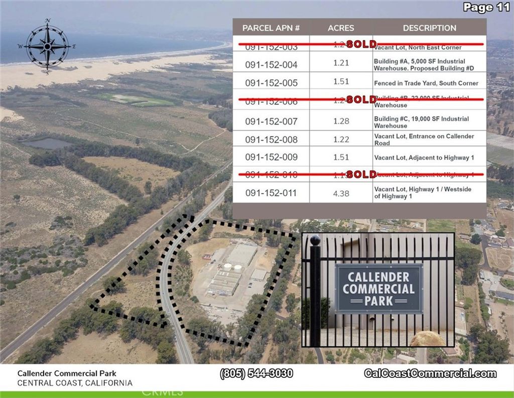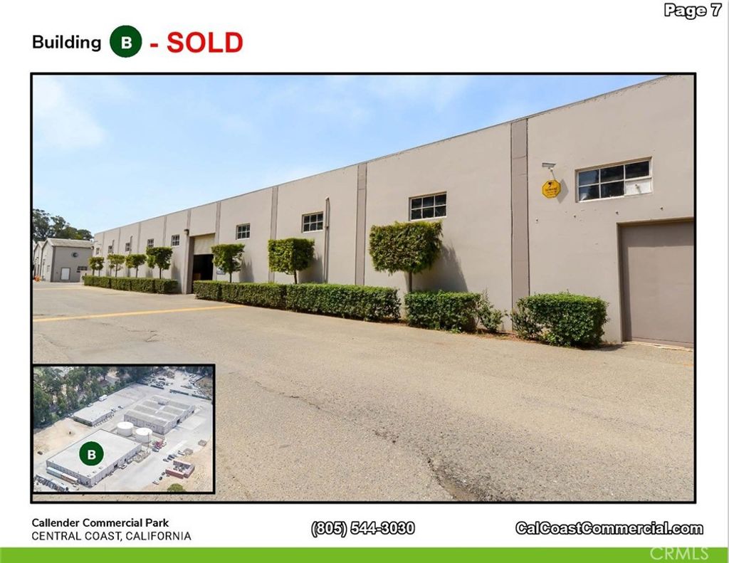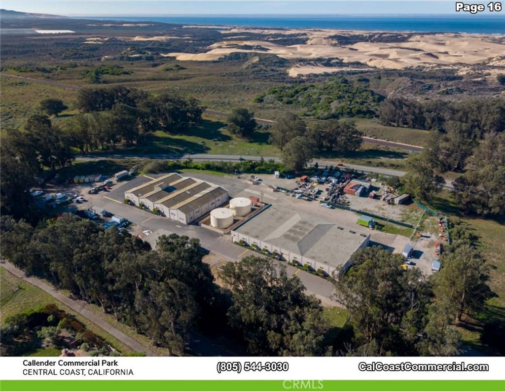 Callendar Commercial Park includes 6 parcels - 2 commercial/ industrial buildings totaling 22,000 sq. feet with commercial/industrial zoning. The 6 parcels together total 11.2 acres. Each of the two buildings are 19,000 and 5,000 square feet, respectively. The property interior has automatic gate and fenced on the Arroyo Grande Mesa directly off Highway 1. The 6 parcels could be zoned for a variety of uses including RV Storage, manufacturing or traditional warehouse use. Most recently the two buildings were used for indoor agricultural growing. The Callendar Commercial Park zoning allows for construction of a caretaker unit on each parcel and could allow for beautiful views of the Pacific Ocean. Building A: A freestanding, single story building with 2 ADA bathrooms and offices. 5,000 square feet Building C: A freestanding, single story, reinforced concrete industrial building is 19,000 square feet. This building is sprinklered and has multiple temperature controlled interior rooms serviced by air conditioning. In addition, it has 2 ADA complient bathrooms, offices vast tall ceilings and 6 roll-up doors throughout with 400 amp/ 3 phase power. Building D: A proposed 2 story reinforced concrete building aproximately 9,240 square feet situated adjacent to, and on the same parcel as Building A.