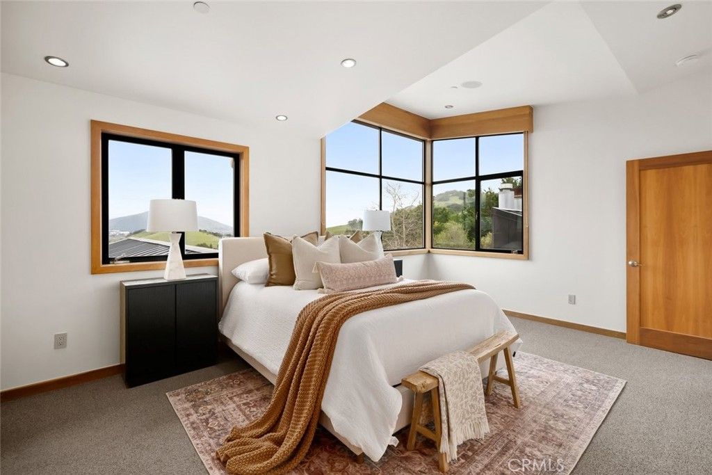 Welcome to 1777 Paseo de Caballo at Rancho Caballo Estates, one of the most rare and sought after gated enclaves of San Luis Obispo. This bespoke community of only a dozen homes is conveniently located a few miles from Downtown San Luis Obispo while being surrounded by over one hundred acres of open grazing and ranching area within the confines of Rancho Caballo. Enjoy breathtaking views of Bishop Peak, surrounding hills, the city, and the lush landscaping surrounding this property. This residence is being offered for the first time on the market since being custom built in 2006. The home was designed by acclaimed architects Craig R. Smith (AIA) and Peter Danciart (AIA) and received the 2007 Award of Honor for Excellence in Design & Execution by the American Institute of Architects California Central Coast Chapter. This spacious multi-story home (4,132 Square Feet) generously offers an easy single level lifestyle on the entry level which consists of a three car garage, powder room, laundry room, office, kitchen, dining, living, home gym, and an oversized primary suite. The bottom floor features a professional grade home theater room, media storage room, mechanical room, two guest bedrooms with access to an outdoor hot tub area, and full sized guest bath. The top floor features a 475 square foot guest suite with sweeping views, walk-in closet, and a full sized bathroom with an oversized dual-shower. The home is a total of three stories, 4 bedrooms, three and one half bathrooms, and plenty of accessory space and bonus rooms. The 1.23 acre lot is perfectly manicured with mature trees, genuine grass lawn, multiple patios, outdoor wood burning fireplace, reinforced concrete driveway, and plenty of areas for gardening and outdoor activities. Other amenities and features include: Owned rooftop solar, butterfly design metal standing seam roof, large windows and doors throughout including architectural clerestory windows, dramatic vaulted ceilings wrapped in solid red cedar, polished concrete floors throughout with radiant heating at every level of the structure, solid wood casements on all windows and doors, open concept architectural staircase with metal railings, three oversized sliding glass doors in the living area for indoor-outdoor living, luxury designer kitchen appliances, and a 1500 gallon concrete septic tank. This is truly one of the most architecturally unique custom home offerings to have ever publicly hit the for-sale market in San Luis Obispo.