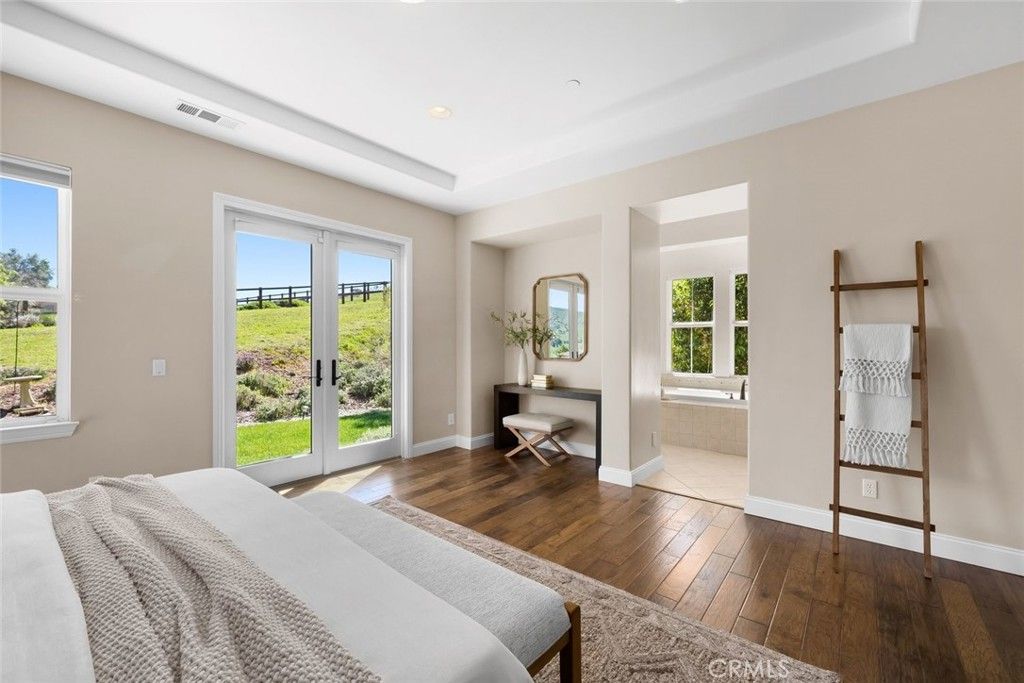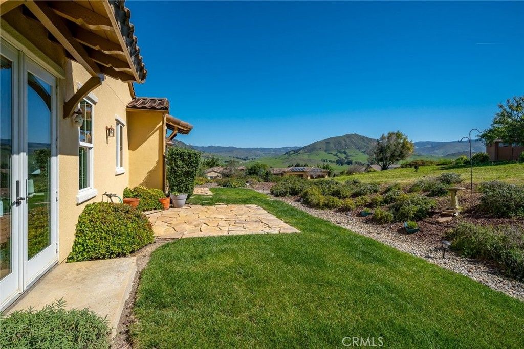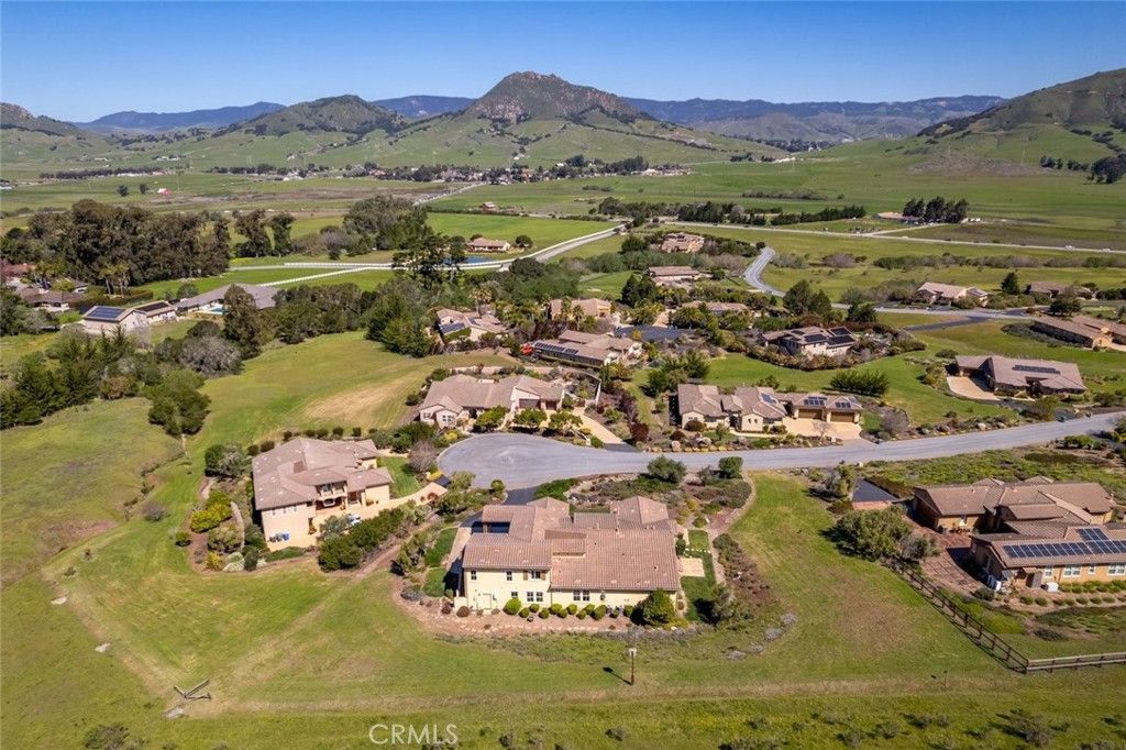 Set within the coveted Valle Vista Ranch community, this extraordinary Mediterranean-style estate captures the essence of Central Coast living with sweeping, cinematic views of Bishop Peak, Cerro San Luis, and the rolling hills that define San Luis Obispo. From the moment you arrive, the beautifully landscaped approach, lush lawns, and charming portico set a tone of timeless elegance, welcoming you into a residence where every detail has been thoughtfully curated. The grand foyer opens to a stunning office space with soaring ceilings and picturesque vistas. Designed for both refined entertaining and everyday comfort, the home features rich hickory wood and tile flooring throughout. A formal dining room, illuminated by a striking chandelier, is complemented by a stylish dry bar with wine storage and positioned perfectly to take in patio access and breathtaking views. The living room blends warmth and grandeur with a cozy fireplace and seamless connection to the expansive kitchen with abundant cabinetry, a spacious center island, stainless steel appliances, and a walk-in pantry create a true culinary haven. Luxury continues with four spacious bedrooms, each with its own ensuite bath. The downstairs primary suite is serene, featuring French doors to a private stone patio, a spa-inspired bath with a jetted soaking tub, dual vanities, dedicated makeup counter, walk-in tile shower, private water closet, and generous walk-in closet. Additional accommodations are equally impressive. One bedroom boasts its own sitting room with a dry bar, microwave, and refrigerator, while another offers a beautifully functional ensuite. A well-equipped laundry center with utility sink, ample storage, and a convenient half bath complete the lower level. Upstairs, a truly exceptional private suite offers flexibility for guests, multi-generational living, or a luxurious retreat. With both interior access and a separate entrance from the stunning balcony, this space showcases panoramic views of the surrounding peaks and hills. Boasting a spacious sitting area, wet bar with refrigerator, spa-like ensuite bath with copper fixtures, dual vanities, a wet room with soaking tub overlooking the scenery, and not one, but two, walk-in closets. An attached two-car garage and single-car garage completes the home. Set on nearly an acre of beautifully curated grounds and coveted cul-de-sac. A home of this caliber is more than a place to live, it's an experience.