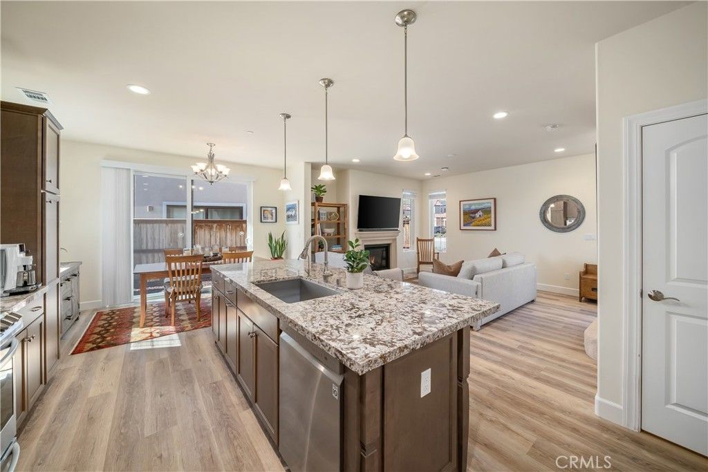 Italian-inspired residence in the Toscano community. Nestled among the picturesque South Hills Open Space, this timeless enclave of homes enjoys views of surrounding mountains, tranquil hiking trails, and convenient access to vibrant downtown San Luis Obispo, the Public Market, Trader Joe's, and the SLO County Regional Airport. Offering three spacious bedrooms and three luxurious baths, this Lambrusco plan provides approximately 1,567 square feet of thoughtfully designed living space. Perfectly positioned to embrace the area's natural beauty and the sought-after SLO lifestyle, the home exudes comfort and style. Upon entering the inviting floor plan, you're welcomed by upscale finishes including luxury vinyl plank flooring, smooth trowel-finished walls, window coverings, and 8-foot doors. The living room is a comfortable space centered around a cozy Heat & Glo fireplace with a precast concrete surround and mantel"”ideal for unwinding after wine tasting in Edna Valley or a day at Avila Beach. The designer kitchen is an entertainer's dream, featuring an expansive island with bar seating, pendant lighting, and granite slab countertops. Premium alder cabinetry with soft-close features, LG appliances, a walk-in pantry, and an adjacent dining area with a striking hanging fixture create an ideal setting for gathering with friends. The private owner's suite offers a peaceful retreat with breathtaking mountain views, a walk-in closet, and a tastefully upgraded bathroom with dual sinks, granite countertops, and a curbless walk-in shower with a frameless enclosure and tiled surround. Two secondary bedrooms, located adjacent to a well-appointed full bathroom, offer flexibility for use as a guest room, home office, or study. The rear yard, framed by peaceful rolling hill views, is ideal for weekend barbecues and outdoor entertaining. The dual-door two-car garage features overhead storage, providing ample room for surfboards and mountain bikes, along with a 220-volt outlet for EV charging. Additional highlights include a laundry area with upper cabinetry, upgraded plush carpet, keyless entry, video doorbell, tankless water heater, water softener, air conditioning, and hand-troweled acrylic color-coat stucco.