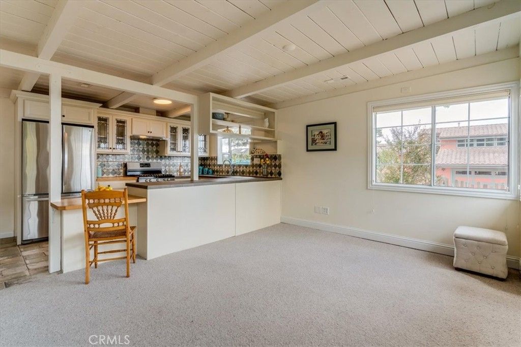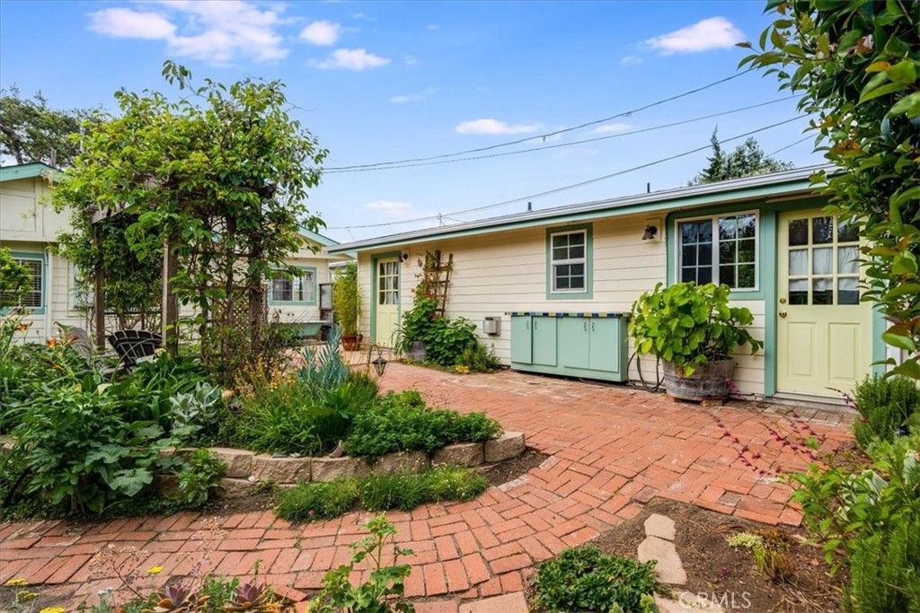 This Absolutely Charming, single level, Happy Hill home is full of desirable features. First and foremost, it is a single level home with an ocean view from both the interior and the front garden! Secondly, it has a vacation rental license plus there is a main house and a guest cottage. The main house has an open floor plan with a 31,000 BTU gas free standing fireplace in one corner of the living area, and an ocean view in the other. A charming, tiled kitchen has tile backsplashes, stained glass front upper cabinets, and both tile and butcher block counters. A garden window with a peek of ocean view is visible right from the kitchen sink. The dining nook connects the kitchen and living room. Extra storage is found in the large pantry at the end of the hall. There are three bedrooms, a bathroom and a half, and interior laundry room. One of the bedrooms has a sliding glass door to the patio and gardens, another has an exterior door to the side yard. Charming tile is found throughout the home. One bathroom has a solar tube for extra sunlight, there is a tankless hot water heater, and the home has Solar for zero or next to nothing electricity bills. The exterior of the property has been lovingly curated. There are cement patios and meandering brick paths between the well-maintained gardens. There are many places to sit and enjoy the birds, a glass of wine, or a cup of coffee in the morning. There is even an outdoor bathtub! The guest cottage has a gas fireplace, tiled bathroom, and large guest kitchen with a door to the back patio. There is also a heat pump mini split. This incredible location is a short jaunt to town or Moonstone Beach.