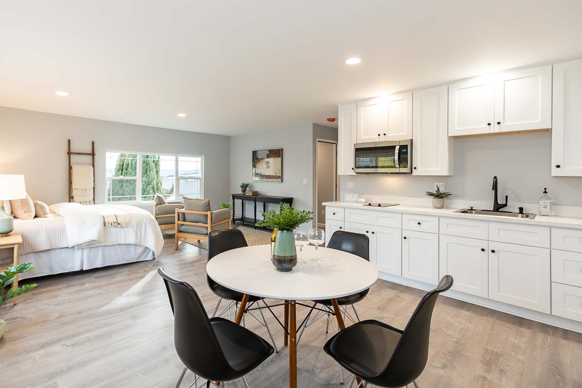 Pristinely updated home with secondary suite above garage in a great SLO neighborhood. No corners were cut in the remodeling of this home with 3-bedrooms, 2-bathrooms + vast secondary suite with bathroom above garage. The extensive remodel includes a new roof, HVAC, electrical, plumbing, siding, doors, waste/water lines, landscaping, owned solar and newer windows – it’s a like-new home that radiates curb appeal. Entering the main 3-bed/2-bath home you’re greeted by an open-concept great room with new electric fireplace, LVP flooring throughout and recessed lighting. The exquisite kitchen has quartz countertops, subway tile backsplash, SS appliances, new white shaker soft-close cabinets and bar seating with pendant designer lights. The kitchen is open to the dining area with striking chandelier. The main home includes 3-bedrooms and two bathrooms both with modern tile finishes. The slider from the great room leads to the private and landscaped backyard on this almost 7,500 sq. ft. lot. With a separate entrance, the suite above the garage is enormous with views of the surrounding mountains. The suite includes LVP flooring, kitchenette with quartz countertops and new cabinets, and elegantly remodeled bathroom. This is a unique opportunity to own a like-new home with guest unit in an established neighborhood on a large lot. It won’t last long!
